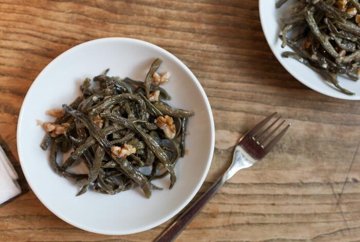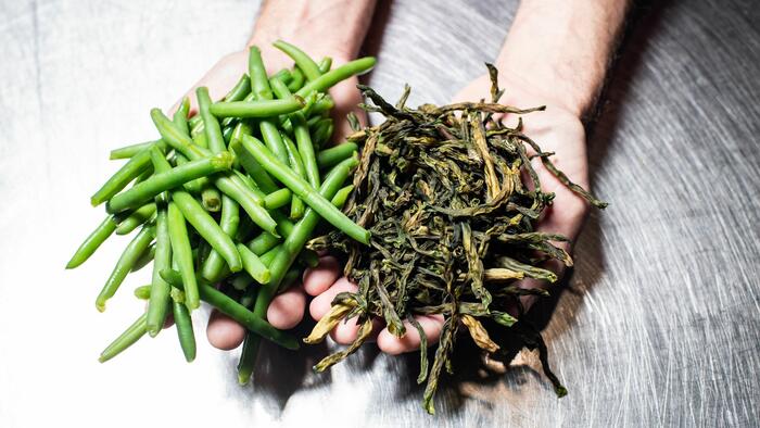 Er gehört zu den Klassikern, die vom tibits Buffet inzwischen nicht mehr wegzudenken sind: der Dörrbohnen Salat. Die knackigen grünen Bohnen werden im Sommer im solothurnischen Welschenrohr geerntet und dann sorgfältig bei tiefer Temperatur getrocknet. So werden die Bohnen nicht nur länger haltbar gemacht, sondern erhalten auch ihren feinen nussigen Geschmack. Auf dem Buffet verfeinern wir sie dann noch mit Walnüssen, Zwiebeln, Koriander und einem leichten Dressing. Guten Appetit!