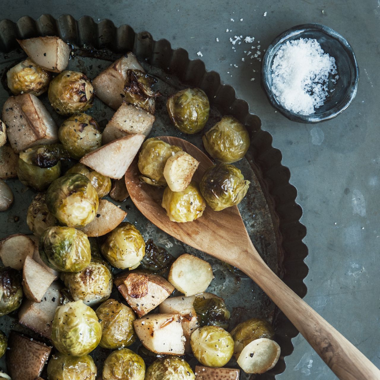 - Einen Topf mit Salzwasser zum Kochen bringen. Den Rosenkohl waschen, putzen, im kochenden Salzwasser 1 Minute kochen, dann abschütten.