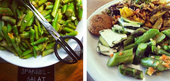 Spargeln bieten endlosen Genuss ohne Sünde, denn sie bestehen aus zu mehr als 90% aus Wasser! 100 Gramm gekochte Spargeln enthalten deshalb nur 13 Kilokalorien. Solange man nicht in die Saucen-Falle tappt, kann man getrost noch ein zweites und ein drittes Mal nachschöpfen.