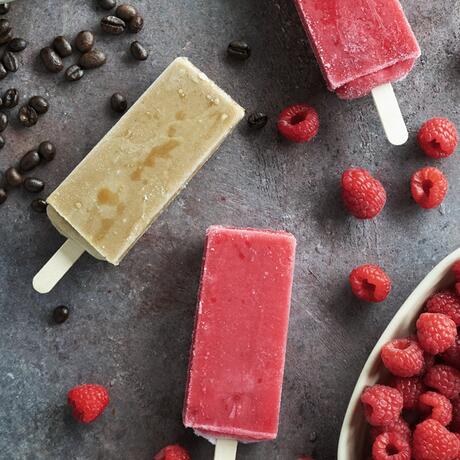 Ihr findet bei uns in der Tiefkühltruhe die Sorten Cappuccino und Hibiskus-Himbeere.