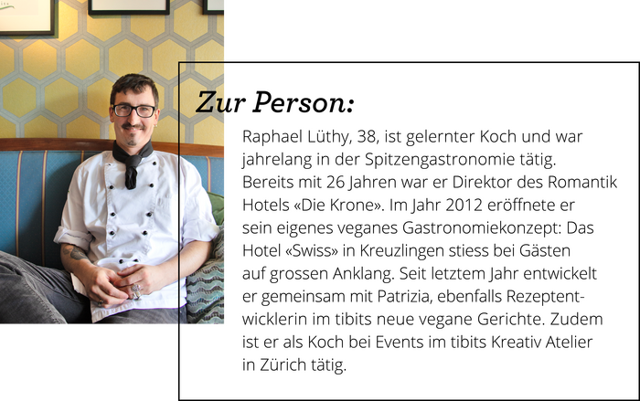 Raphael Lüthy lebt seit 13 Jahren vegan und arbeitet bei tibits als Rezeptentwickler und Eventkoch. Im Gespräch erzählt er, wie er bei der Entwicklung von neuen Gerichten vorgeht, wovon er sich inspirieren lässt und was er Umsteiger:innen auf eine pflanzliche Ernährung empfiehlt.